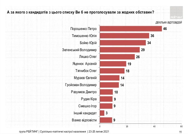 Антирейтинг довіри до політиків очолює Петро Порошенко: 46% не проголосували б за нього за жодних обставин. Ще 34% опитаних не проголосували б за Юрія Бойка (було 36%), 36% – за Юлію Тимошенко (було 32%), 29% – за Володимира Зеленського (проти 27% у червні) і 26% – за Олега Ляшка (проти 24% у червні).