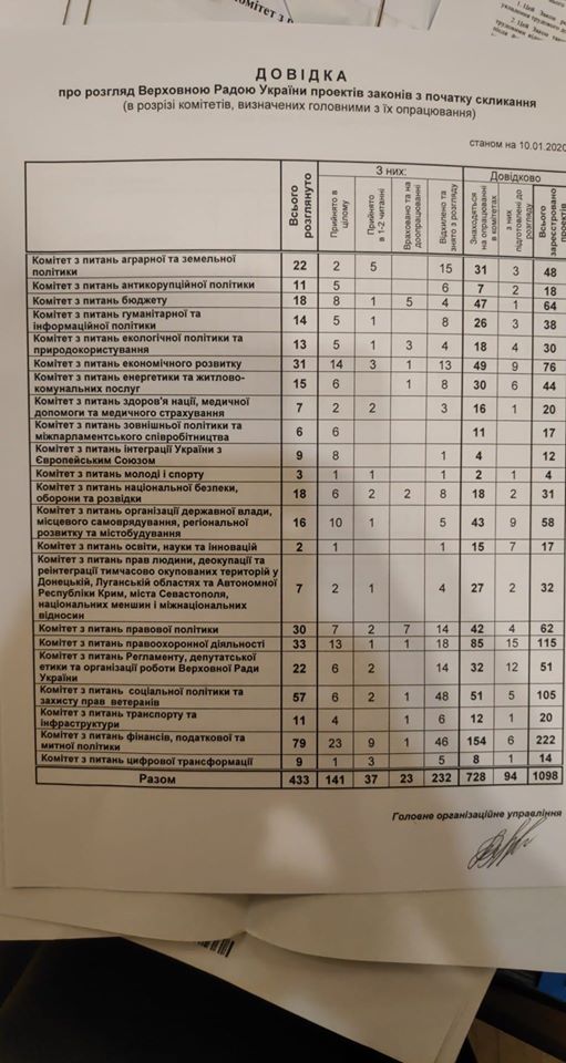 Водночас комітети з питань бюджету та правової політики, отримавши 47 та 42 проєкти законів, опрацювали лише один та чотири відповідно.