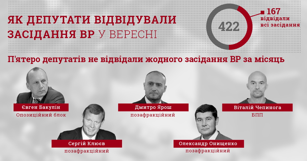 За даними письмової та електронної реєстрації п'ятеро народних депутатів не відвідали жодного засідання за місяць. Це член "Опозиційного блоку" Євген Бакулін, позафракційний Дмитро Ярош, Віталій Чепинога із БПП, а також позафракційні депутати-втікачі Сергій Клюєв та Олександр Онищенко.