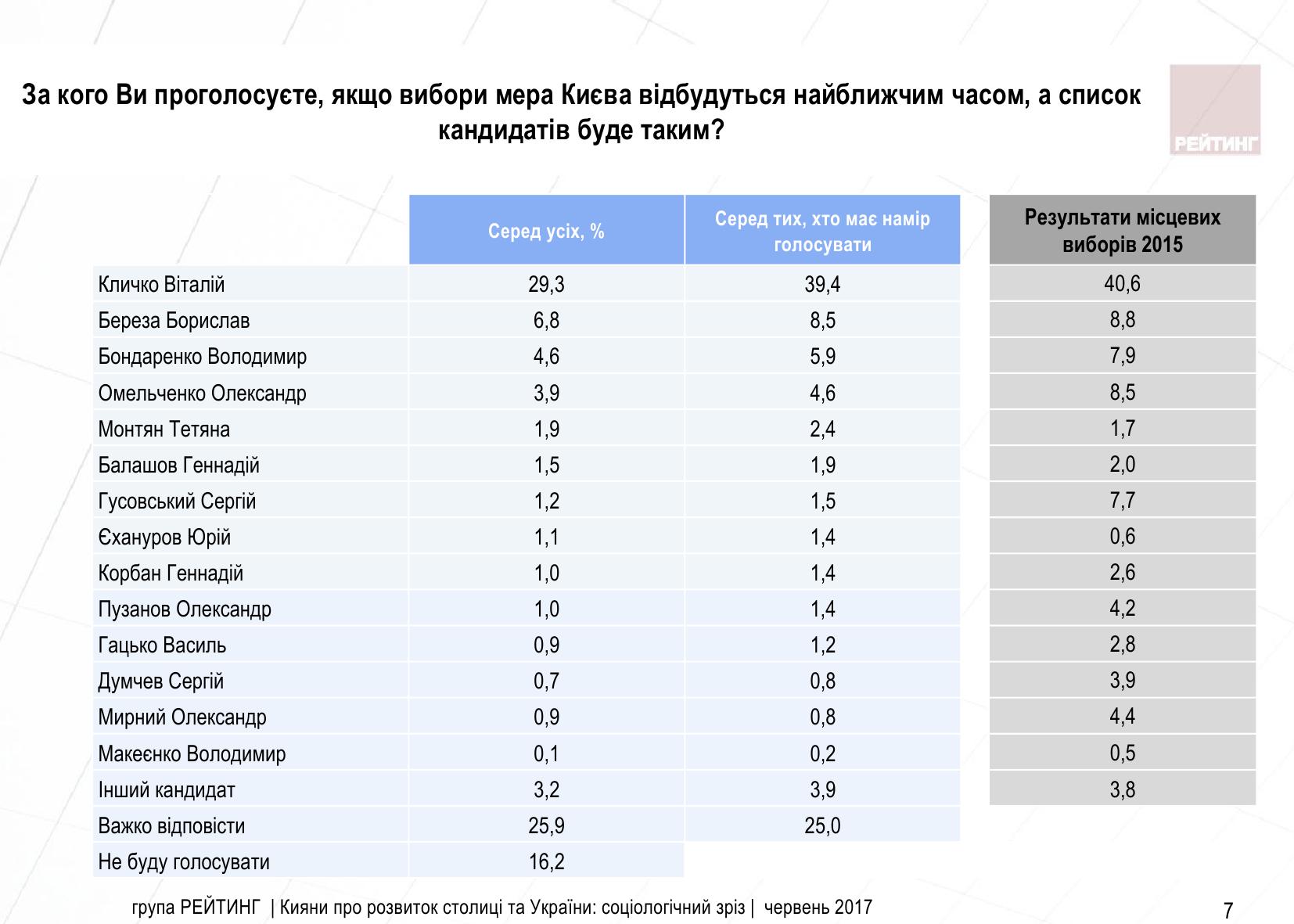 Якщо вибори мера Києва відбудуться найближчим часом, то Віталія Кличка обрали б 39,4% тих, хто має намір голосувати. За Борислава Березу проголосували б 8,5%, за Володимира Бондаренка - 5,9%, за Олександра Омельченка - 4,6%. Не визначилися зі своїми електоральними вподобаннями чверть опитаних.