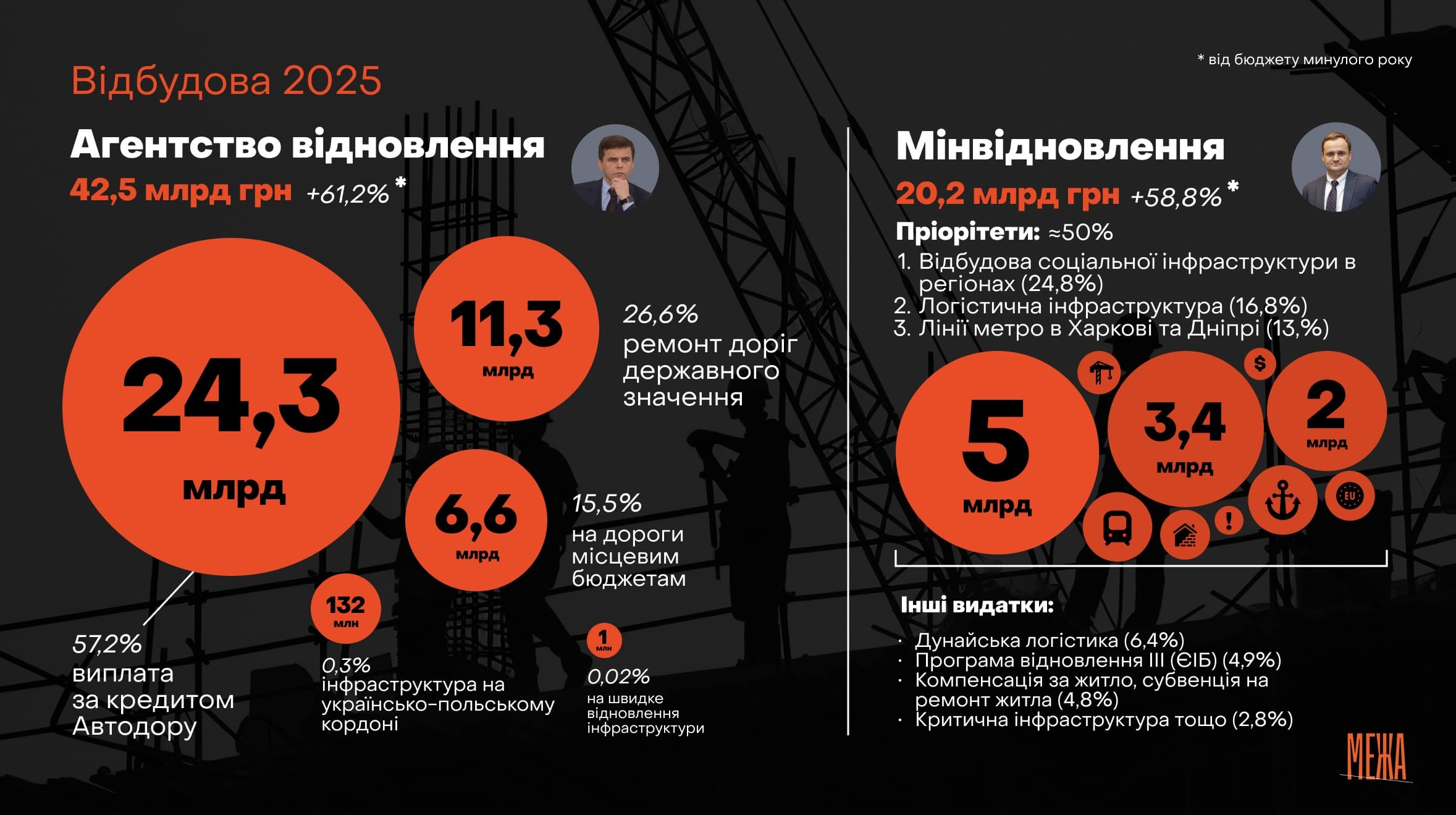 Тобто близько 70% із 62,7 млрд грн бюджетів обох інституцій відбудови 2025 року планують спрямувати на дороги — повернення кредитів за будівництва довоєнних років та нові будівництва доріг.