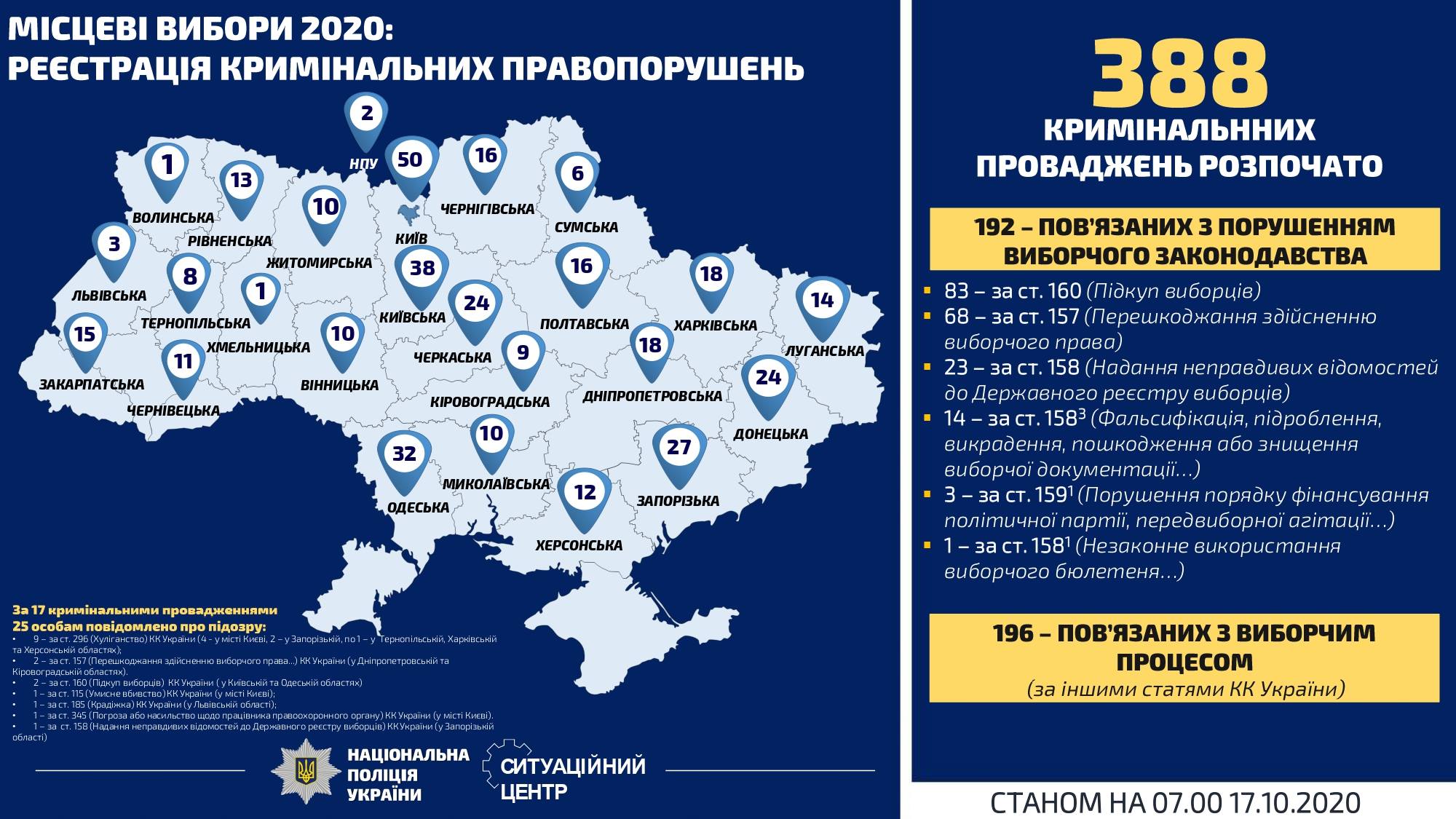 Крім того, за останню добу в поліцію надійшло 256 заяв і повідомлень, пов'язаних з порушеннями виборчого законодавства, відкрито 24 кримінальних провадження. Найбільше кримінальних проваджень зареєстровано в Києві - 36, у Київській області - 29, Дніпропетровській області - 24, в Донецькій області - 22, 15 - в Одеській області, і 14 - в Харківській.