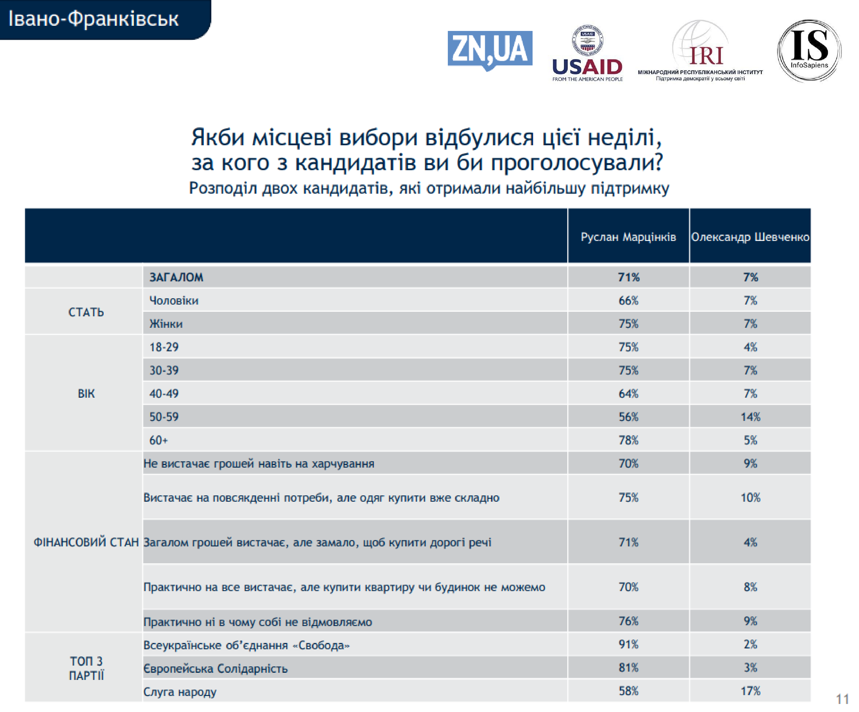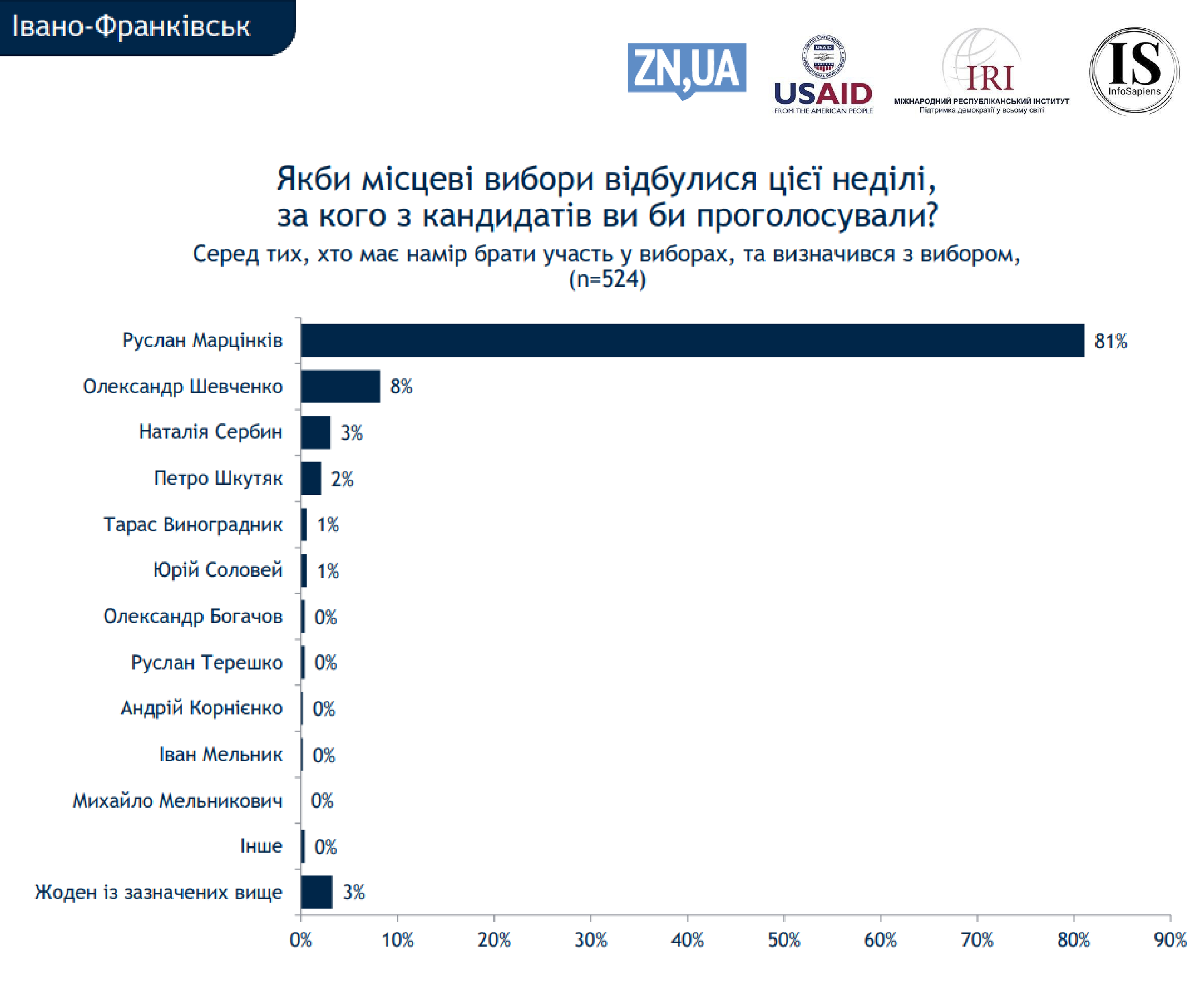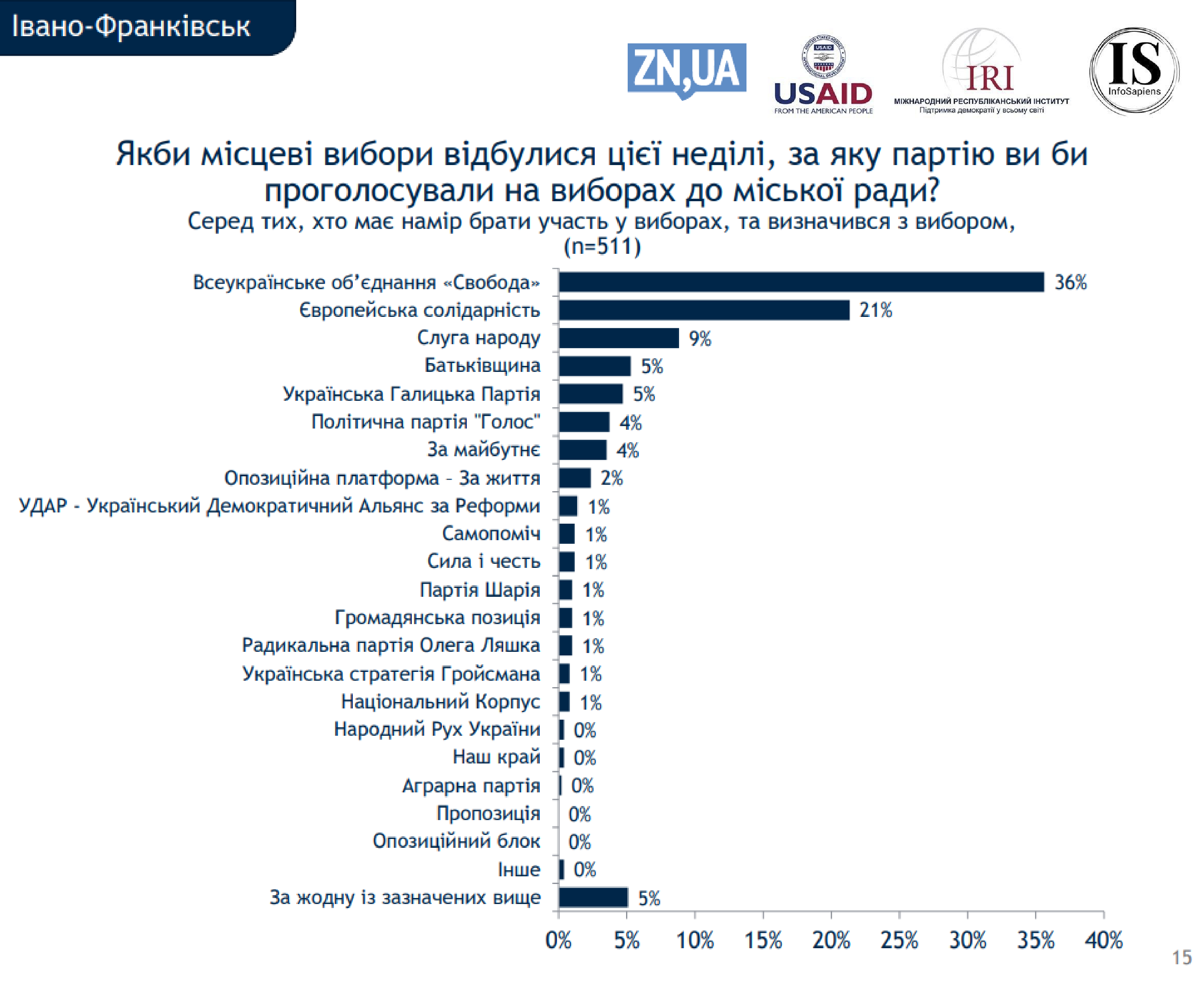 До того ж, за даними опитування Міжнародного республіканського інституту (IRI), який проводила компанія Info Sapiens, серед партій в Івано-Франківську найбільше підтримують "Свободу", за яку готові проголосувати на місцевих виборах 36% виборців, які вже визначилися з вибором.