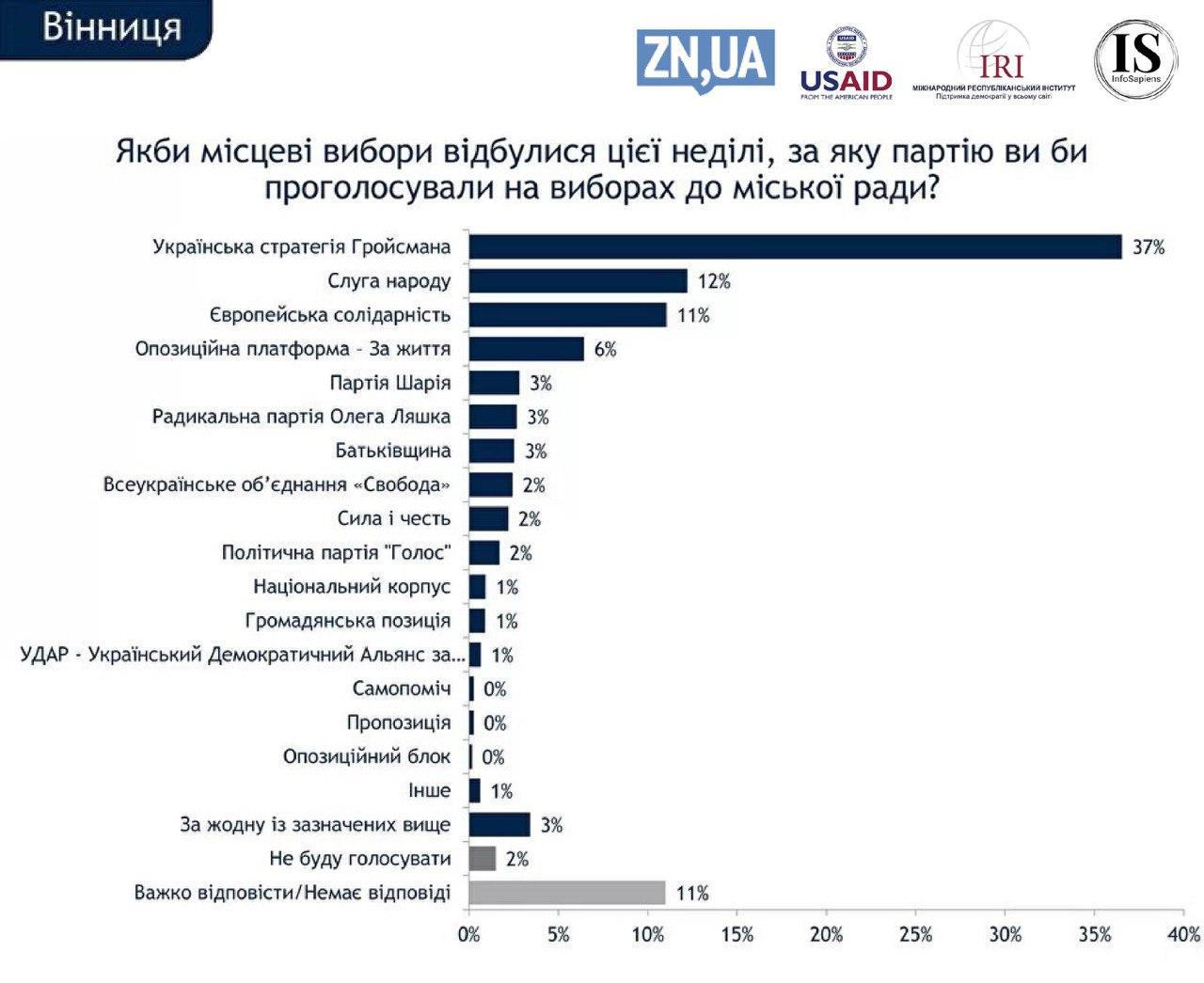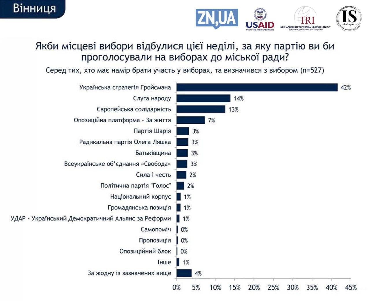 Четверте місце посідає «Опозиційна платформа-За життя», яка користується підтримкою 7% вінничан, які визначилися. «Батьківщину» і «Голос» готові підтримати 3% і 2% городян відповідно.