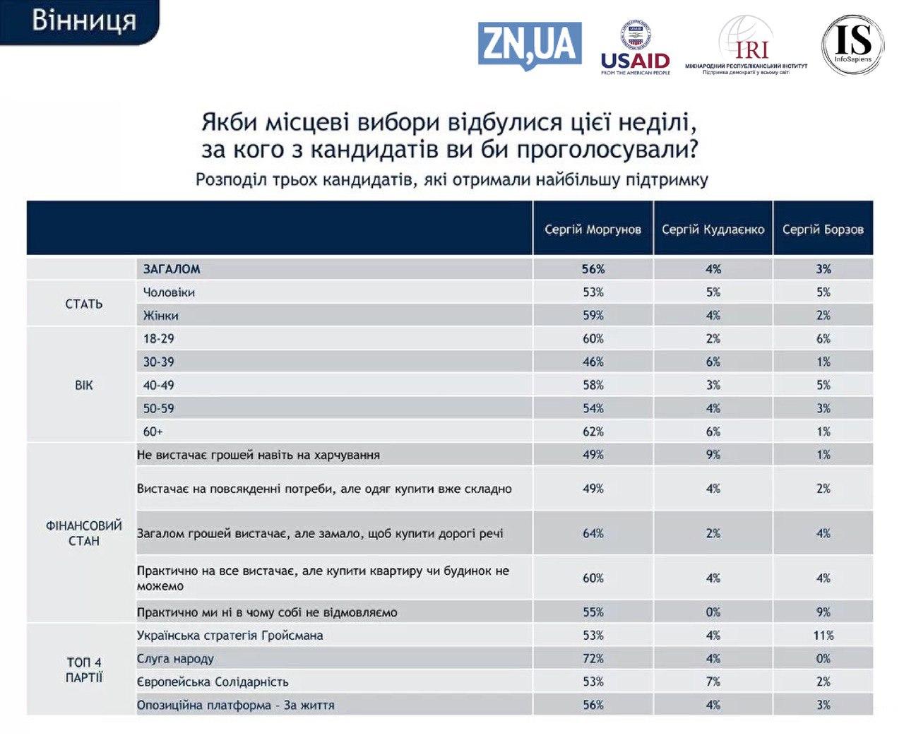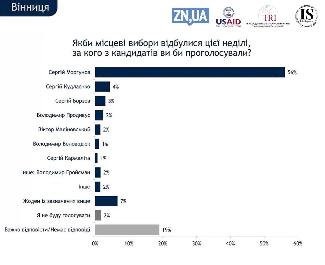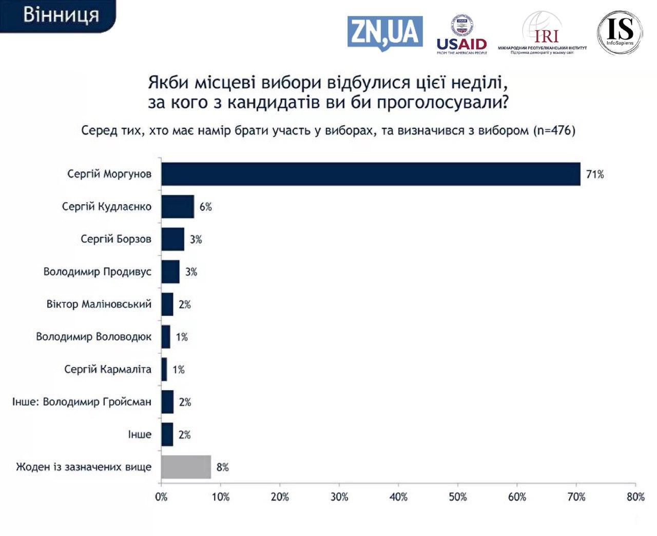 Чинного мера Сергія Моргунова (висуванець «Української стратегії Гройсмана») готові підтримати 72% городян, які визначилися і готові прийти на вибори.