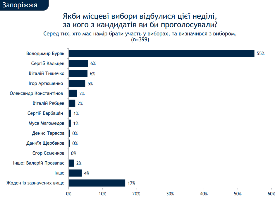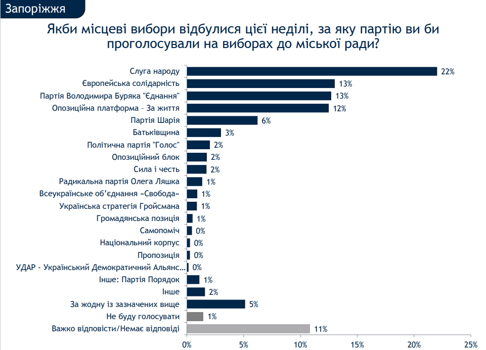 Соціологи підтверджують, що «Єднання» впевнено проходить в міську раду обласного центру, хоча і не з першим результатом (за даними опитування Міжнародного республіканського інституту (IRI), який проводила компанія Info Sapiens, у партії мера 14%), поступаючись лише «Слузі Народу »(25%) і несподівано - «ЄС» (15%). «Опозиційна платформа-За життя» поступово здувається і має такий самий відсоток, як і партія Буряка.