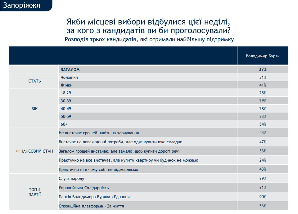 Партію Володимира Буряка «Єднання» підтримують молоді запорожці (14% у віковій групі 30-39 років), 20% з них вистачає грошей на повсякденні потреби, але не вистачає на купівлю нового одягу, ще 22% ні в чому собі не відмовляють. Жінок значно більше - 15% проти 9% чоловіків.