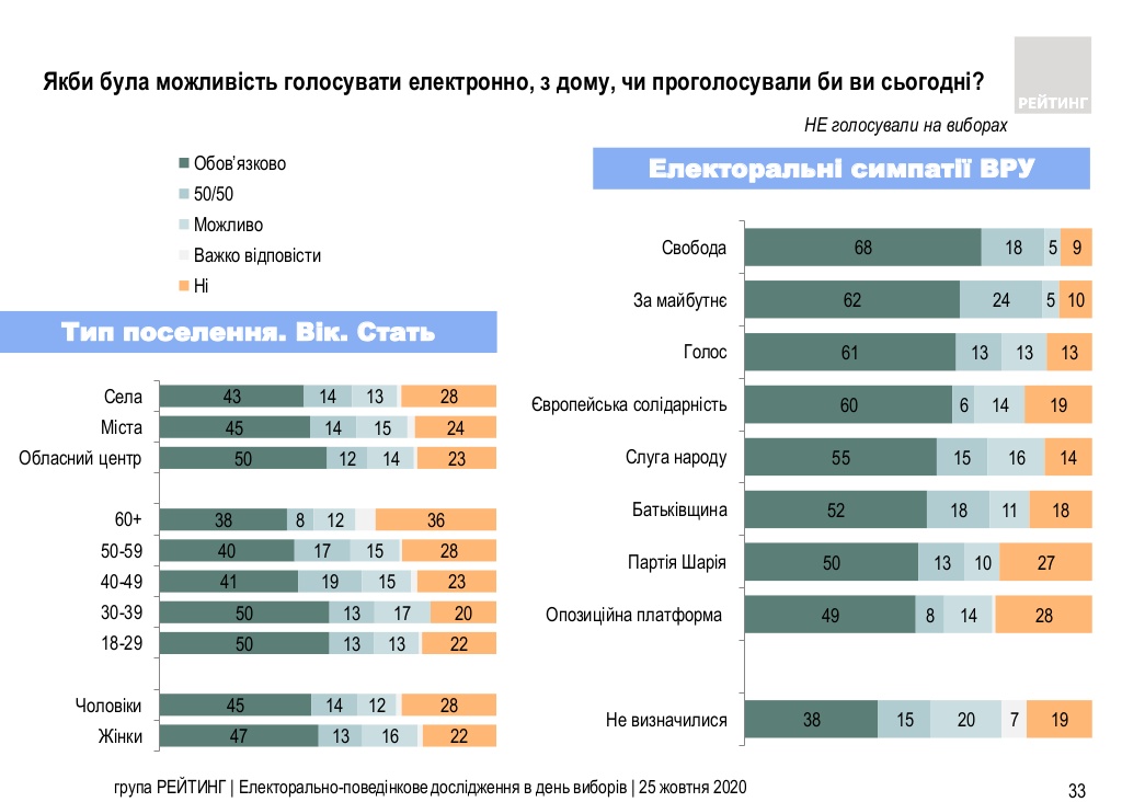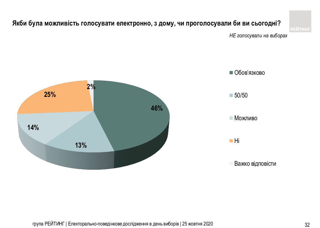 46% респондентів заявили, що обов'язково проголосували б онлайн, якби у них була така можливість. Ще 13% оцінили можливість участі в онлайн-виборах як «50/50».