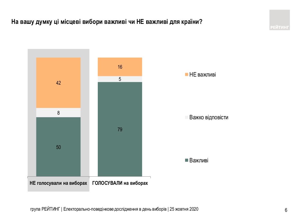 Навіть серед тих, хто в цей раз не голосував, 50% назвали вибори важливими, 42% - вважають навпаки, не змогли відповісти 8%.
