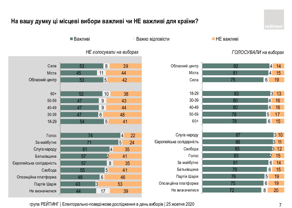 Найбільша частка тих, хто вважає місцеві вибори важливими, серед виборців «Слуги народу», «Європейської Солідарності», «Свободи» та «Голосу». Найбільш скептично налаштовані ті, хто не визначився, а також симпатики «Опозиційною платформи - За життя», «Партії Шарія» і «Батьківщини». Але і серед них частка скептиків не перевищує 15% -20%.