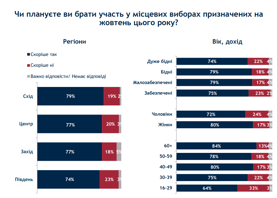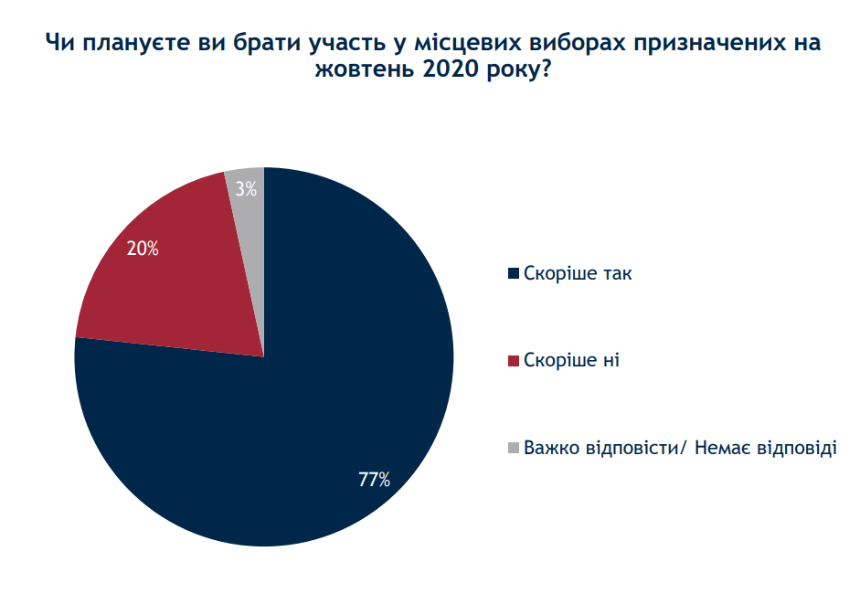 Відзначається, що в цілому у місцевих виборах, призначених на жовтень 2020 року, планують взяти участь 77% українців. 22% респондентів на аналогічне питання відповіли "ні".