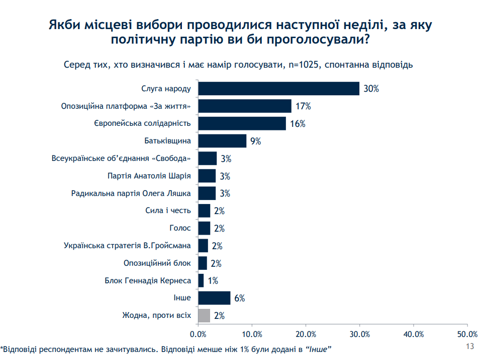 Якби місцеві вибори проводилися в найближчий тиждень, то 30% українців, що визначилися з кандидатурою, готові були б підтримати політичну партію "Слуга народу". Ще 17% підтримали б "Опозиційну платформу "За життя", 16% - "Європейську солідарність". Про це свідчать дані опитування Соціологічної групи" Рейтинг ", яке проводився 30-31 липня.