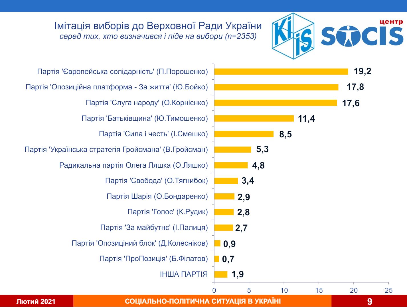 Якби парламентські вибори відбувалися найближчим часом, то за “Європейську солідарність” віддали б свої голоси 19,2% українців, які вже визначилися і підуть голосувати. Про це йдеться у результатах опитування, проведеного Київським міжнародним інститутом соціології та центром Socis.
