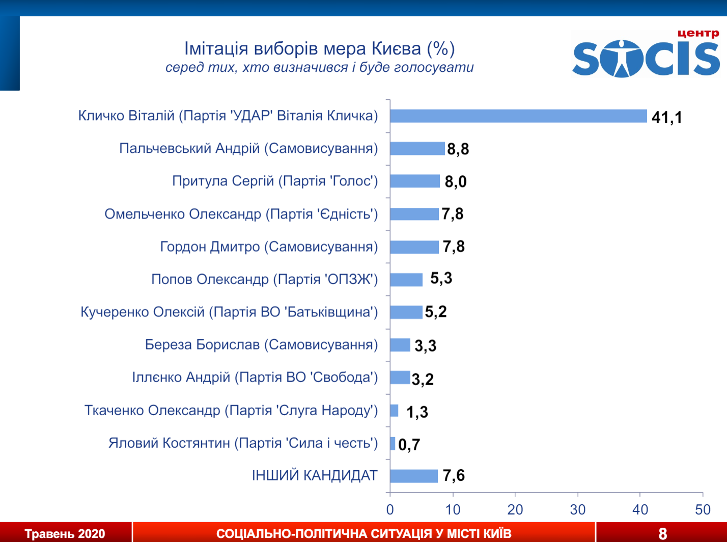 Якби найближчої неділі відбувалися вибори міського голови Києва, то на них переміг би Віталій Кличко, якого готові підтримати 41,1% виборців, свідчать результати опитування, проведеного Центром соціальних та маркетингових досліджень SOCIS. За самовисуванця Андрія Пальчевського проголосували б 8,8% киян.