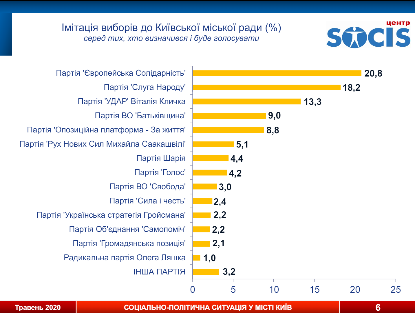 Якби наступної неділі відбувалися вибори до Київської міської ради, то 20,8% киян проголосували б за партію "Європейська солідарність", йдеться у результатах опитування, проведеного Центром соціальних та маркетингових досліджень SOCIS. На другому місці опинилася б партія "Слуга народу", за яку готові віддати свої голоси 18,2% жителів города.