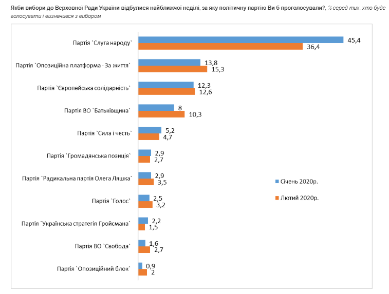 Однак у порівнянні з результатами січневого опитування, рівень електоральної підтримки "Слуги народу" знизився з 45% до 36%. Водночас підтримка ВО "Батьківщина" зросла з 8% до 10%, за "Опозиційний блок" - з 0,9% до 2%.