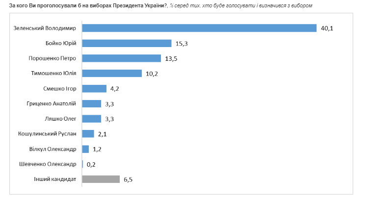 Якби найближчим часом відбувалися президентські вибори, то найбільше голосів би отримав Володимир Зеленський, за якого проголосували б 40% опитаних, які голосуватимуть та вже визначилися з вибором. Ще 15% респондентів віддали б свої голоси за Юрія Бойко (ОПЗЖ), за Петра Порошенка проголосували б 13,5%, за Юлію Тимошенко – 10%.