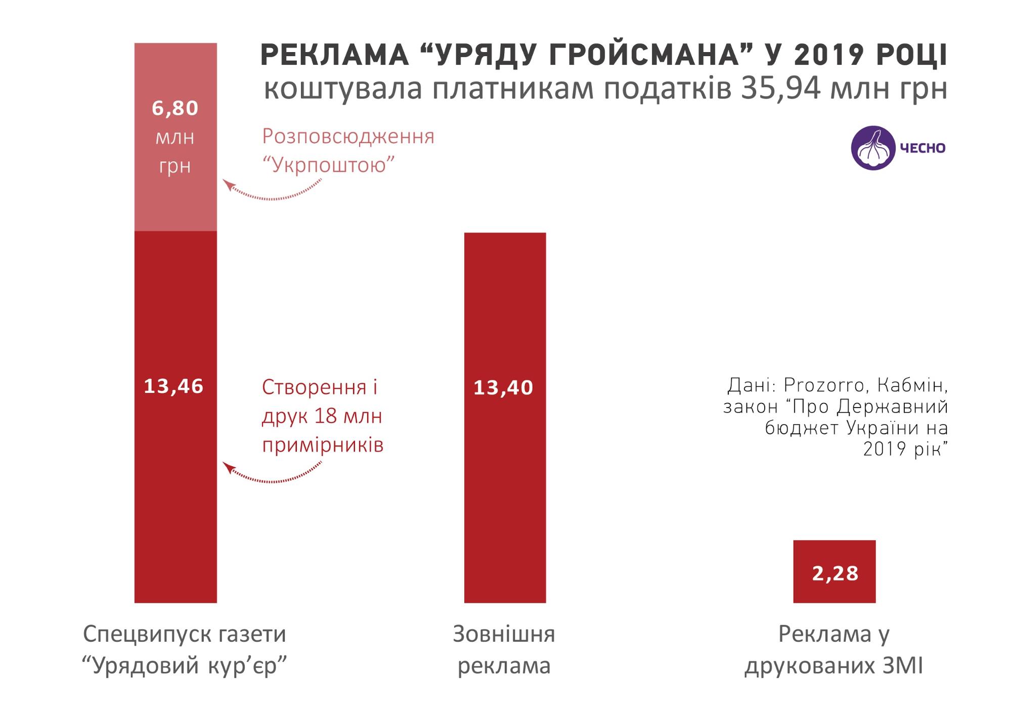 На рекламу "уряду Гройсмана" витратили 35,94 мільйона гривень з коштів платників податків, передає рух "Чесно". Так, весною цього року уряд запустив гасло "Україна – це не просто місце на карті", просування якого оплачували з державного кошту. Також зовнішню рекламу для Кабміну розміщує громадська організація.