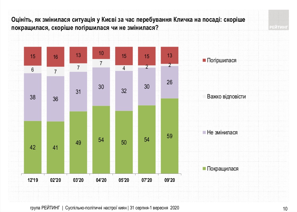 Водночас 59% киян вважають, що ситуація в Києві за час перебування Віталія Кличка на посаді міського голови скоріше покращилася, протилежної думки притримуються 13% респондентів. Ще 26% опитаних кажуть, що ситуація в столиці не змінилася.