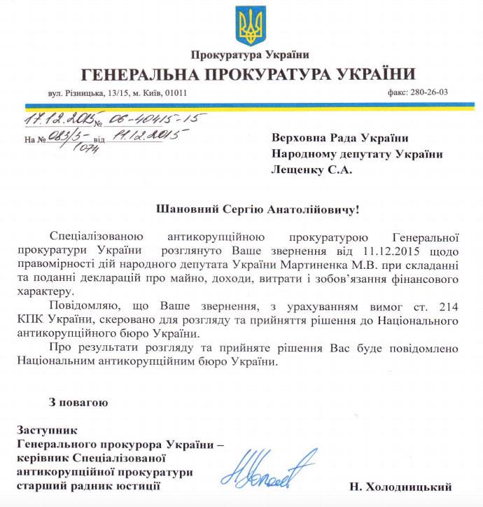 Антикорупційна прокуратура передала Національному антикорупційному бюро запит на перевірку декларації про доходи екс-депутата від "Народного фронту" Миколи Мартиненка, йдеться у відповіді керівника АКП Назара Холодницького на запит депутата від БПП Сергія Лещенка.