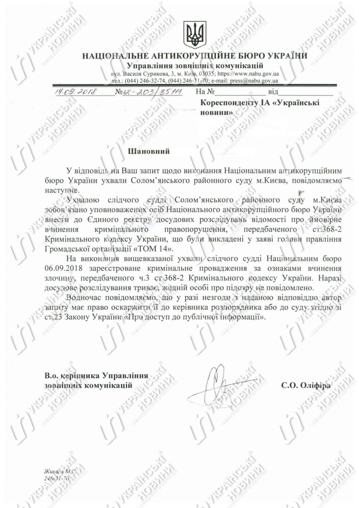 Як йдеться у відповіді відомства, кримінальне провадження зареєстровано 6 вересня в частині 34 статті 368-2 (незаконне збагачення) Кримінального кодексу. Справу відкрито згідно з рішенням суду, який зобов'язав НАБУ його зареєструвати. На даний момент проводиться досудове розслідування.