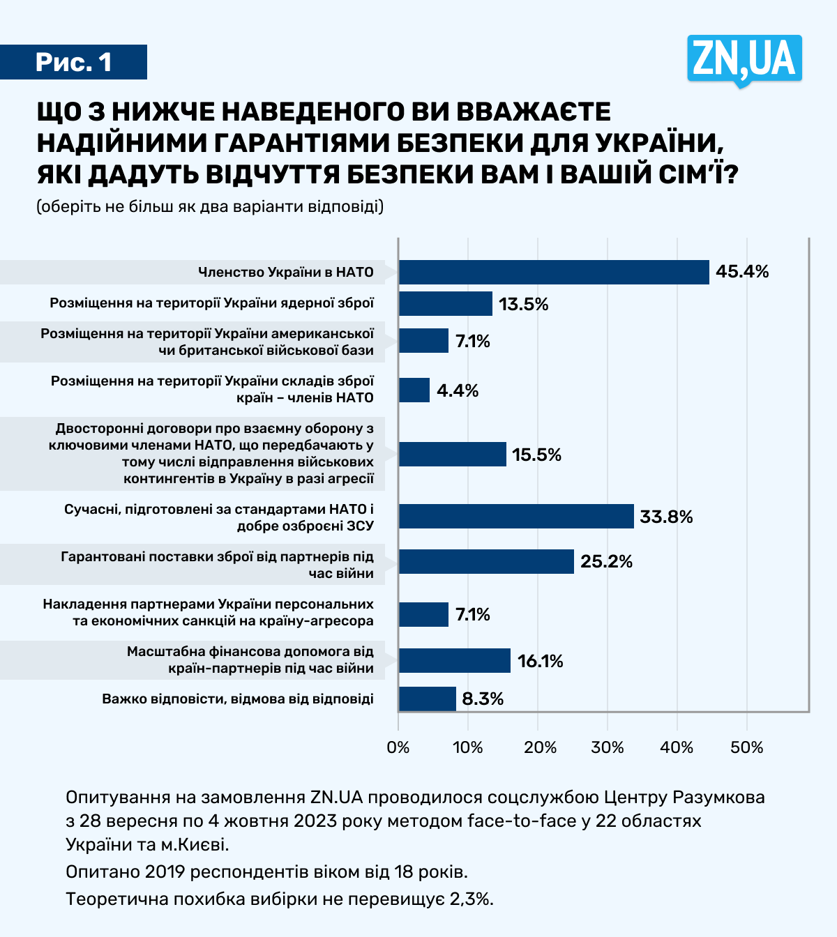 Опитування на замовлення ZN.UA проводила соціологічна служба Центру Разумкова з 28 вересня до 4 жовтня 2023 року методом face-to-face у 22 областях України та м. Києві. Опитано 2019 респондентів віком від 18 років. Теоретична похибка вибірки не перевищує 2,3%.
