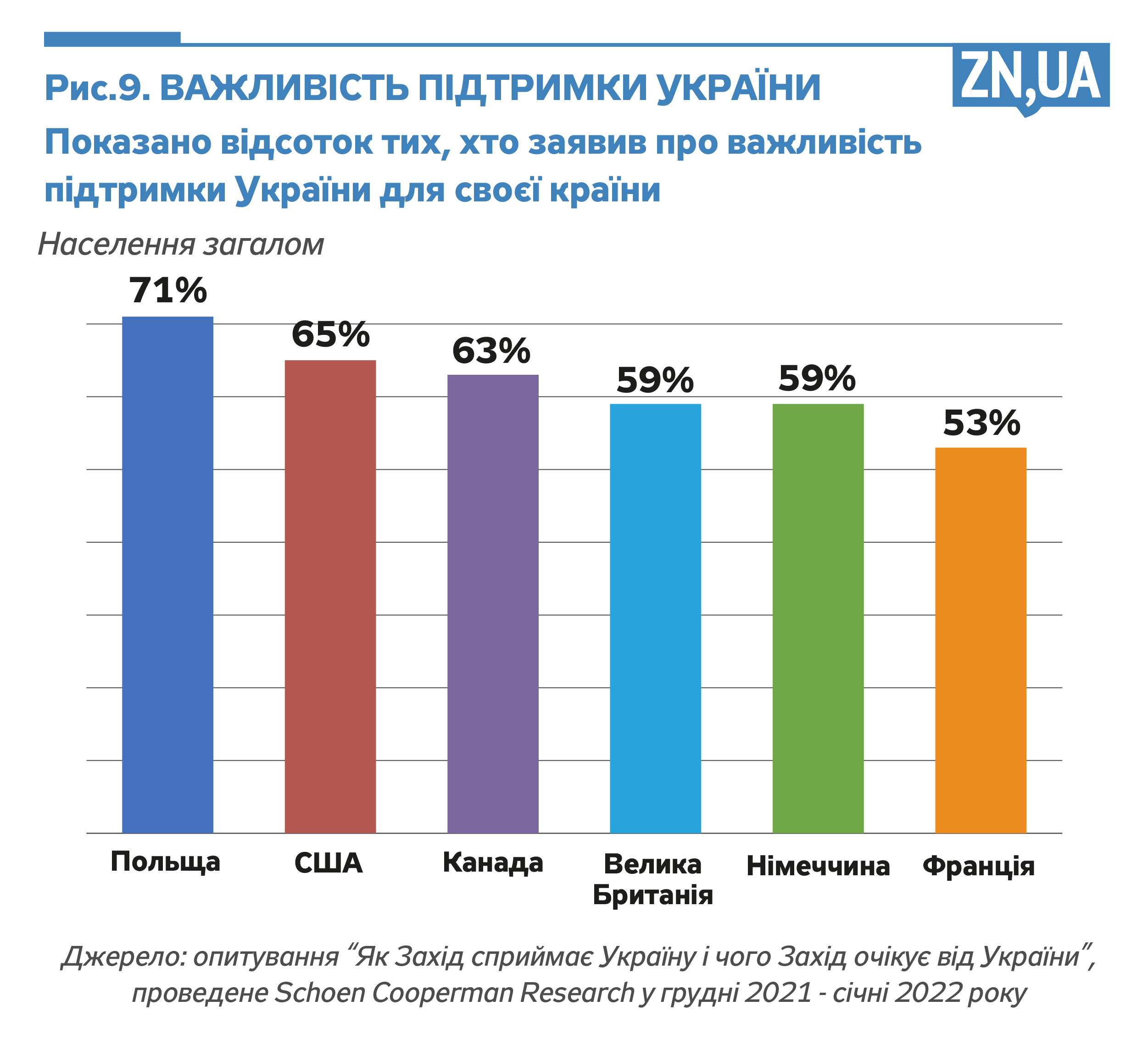 Як засвідчили результати дослідження, навіть у найбільш байдужих чи скептично налаштованих до нашої країни державах понад половину респондентів заявили, що підтримка України важлива для їхньої власної країни. А в Польщі, Сполучених Штатах і Канаді таких — близько двох третин опитаних чи навіть більше, пише редакторка відділу міжнародної політики ZN.UA Тетяна Силіна.