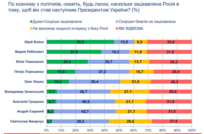 Відповідаючи на питання "По кожному з політиків, скажіть, будь ласка, наскільки Росія зацікавлена в тому, щоб він став наступним президентом України?" 46,5% вказали на можливу підтримку з боку РФ для Юрія Бойка, для Вадима Рабиновича таку ймовірність вбачають 37,9%, що стосується Юлії Тимошенко, то 28,4% опитаних вважають, що її перемога також порадує РФ.