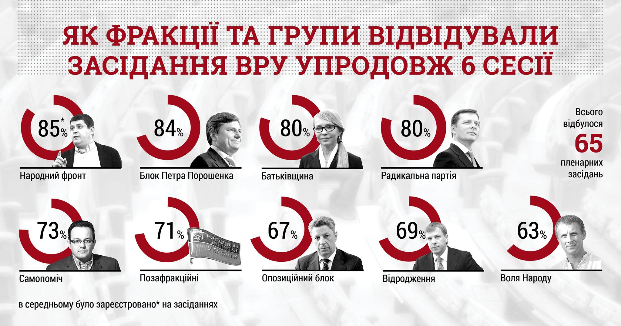 Упродовж шостої сесії Верховної Ради восьмого скликання відбулося 65 пленарних засідань. Як повідомляє Комітет виборців України, в середньому на них були зареєстровані 335 народних депутатів із 422.