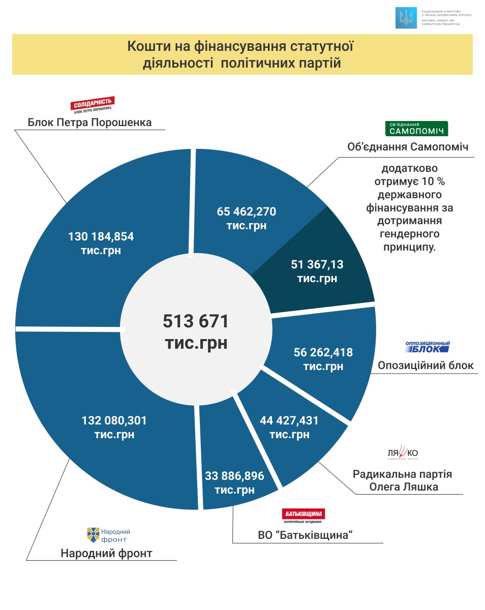 Національне агентство з питань запобігання корупції (НАЗК) розподілило 513 млн 671 тисяч гривень на фінансування статутної діяльності шести політичних партій у цьому році, повідомляє прес-служба агентства.