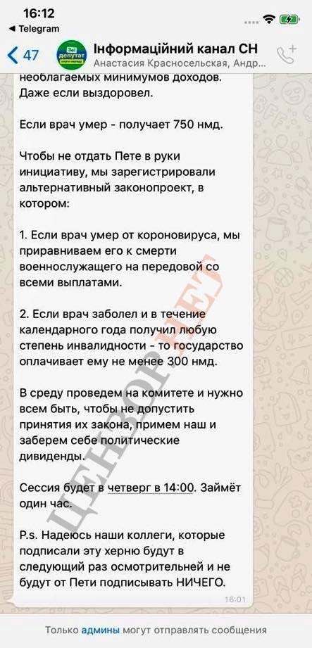 Про це свідчать скріншоти інформаційного каналу фракції "Слуга народу" в Telegram, які опублікував Цензор.НЕТ.