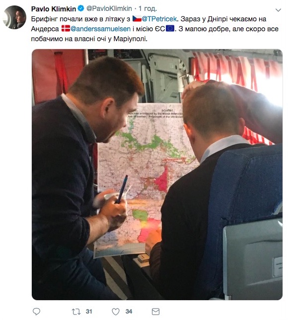 "Брифінг почали вже в літаку з Томашем Петршичеком. Зараз у Дніпрі чекаємо на Андерса Самуельсена і місію ЄС. З мапою добре, але скоро все побачимо на власні очі в Маріуполі", - написав міністр.