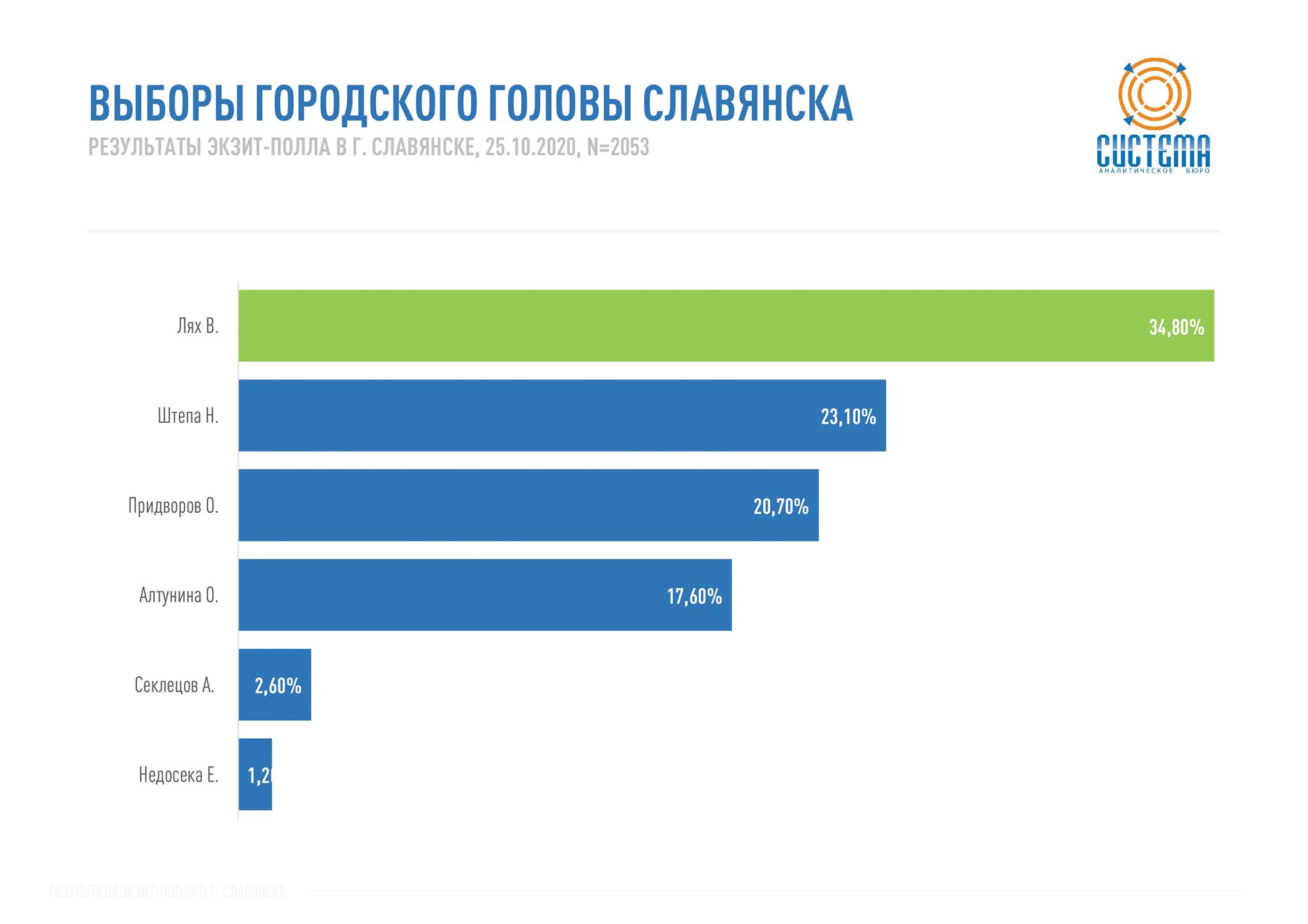 В рамках екзитполу були опитані 2 тисячі 53 виборця Слов'янська, статистична похибка не перевищує 1,9%.