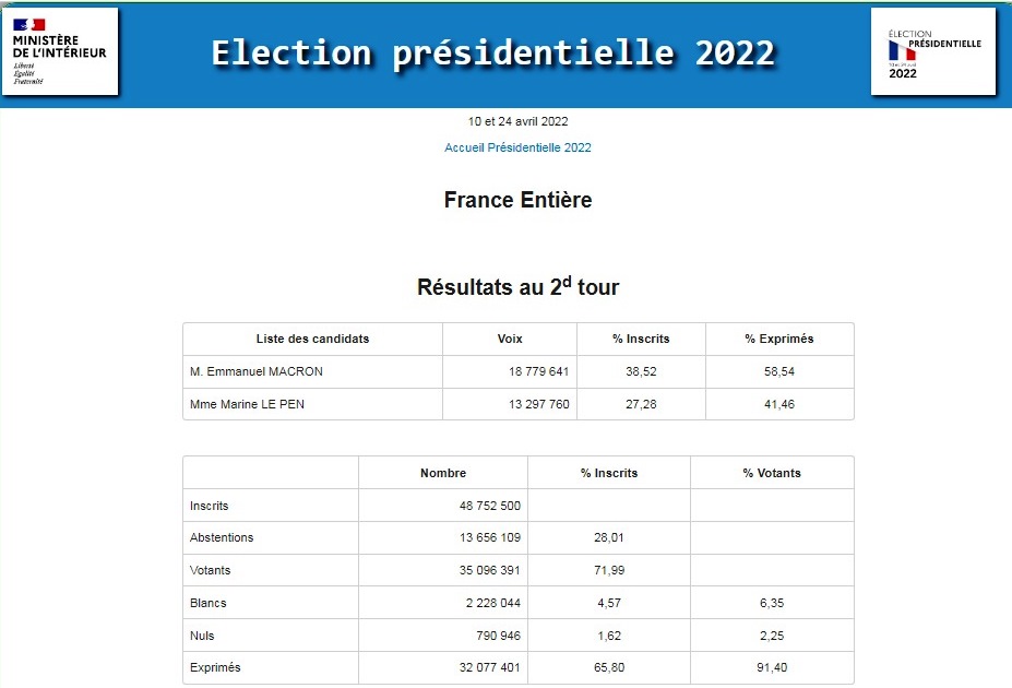 У Франції підраховано 100% голосів виборців. За офіційною інформацією Міністерства внутрішніх справ, з перевагою понад 17% переміг Еммануель Макрон.