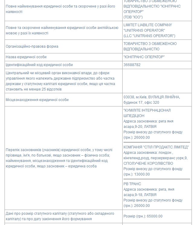 У держреєстрі вказані засновник "Юнітранс Оператору" - це латвійські компанії "Куміліте Інтернаціонал Шпедиціон" і "РВ Транс", а також "Стіл Продактс Лімітед" (Сполучене королівство).