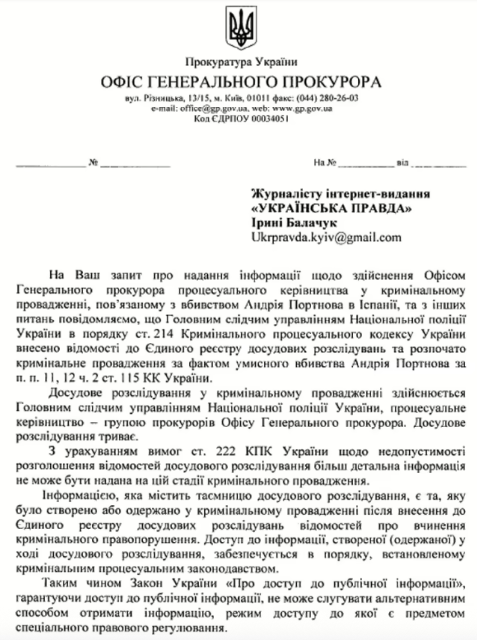 Нацполіція відкрила кримінальне провадження за фактом вбивства в Іспанії першого заступника адміністрації Януковича Андрія Портнова. Досудове розслідування проводять за п. п. 11, 12 ч. 2 ст. 115 КК України (умисне вбивство), процесуальне керівництво здійснює Офіс генпрокурора, йдеться у відповіді ОГП "Українській правді".