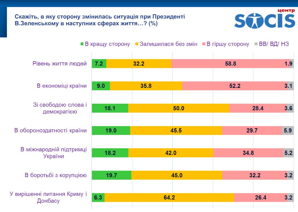 Думки про те, що за президентства Володимира Зеленського рівень життя людей в Україні змінився в кращий бік, притримуються 7,2% громадян, йдеться в результатах опитування центру SOCIS. Ще 58,8% переконані, що рівень життя погіршився, 32,2% - не бачать змін.