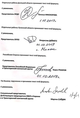 Російська сторона наполягала на спільному підписанні "формули Штайнмаєра", але Україна відмовилася. Згоду на імплементацію формули оформили окремими особистими листами на адресу ОБСЄ від представника України та від "Л-ДНР".