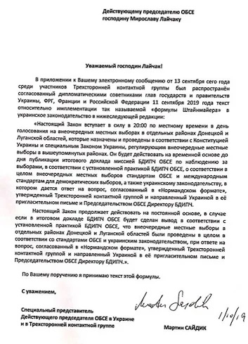 Окремого листа очільнику ОБСЄ Мирославу Лайчаку підписав представник організації у Мінську Мартін Сайдик, його копію оприлюднило російське видання "Коммерсантъ".