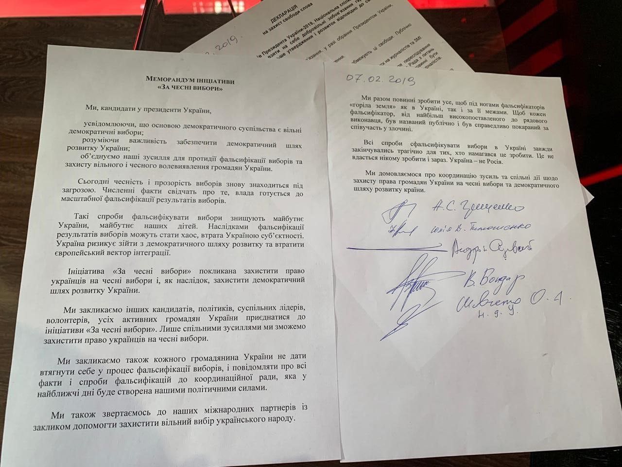Кандидати в президенти Юлія Тимошенко, Андрій Садовий, Анатолій Гриценко, Олександр Шевченко та Віктор Бондар підписали меморандум "Про чесні вибори", яким зобов'язалися перешкоджати фальсифікації результатів виборів. Підписання меморандуму відбулося в ефірі програми "Право на владу" в четвер увечері.