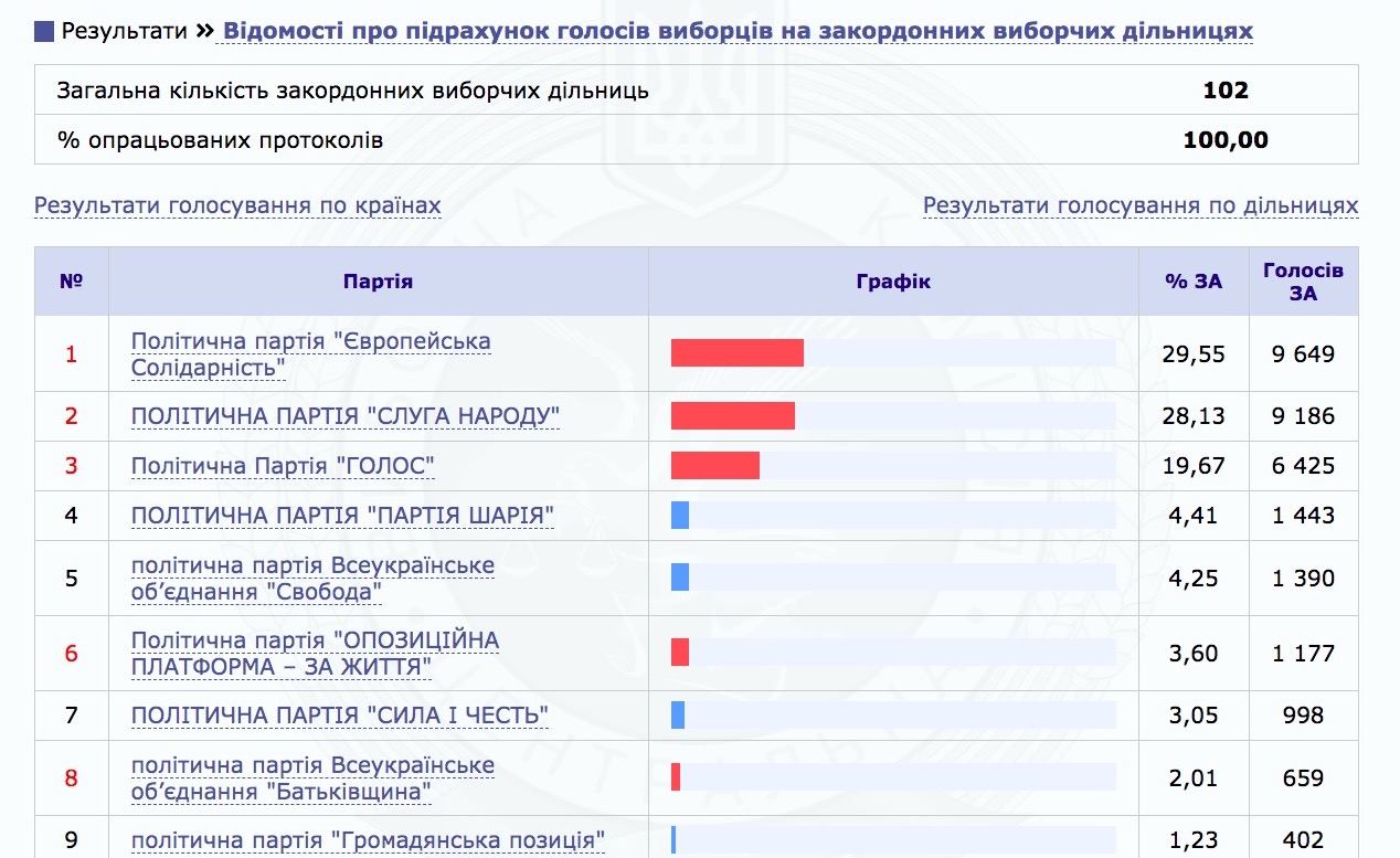 Політична партія "Європейська солідарність", лідером якої є п'ятий президент України Петро Порошенко, перемогла у закордонному виборчому окрузі на виборах у Верховну Раду з результатом 29,55% голосів (9 649).