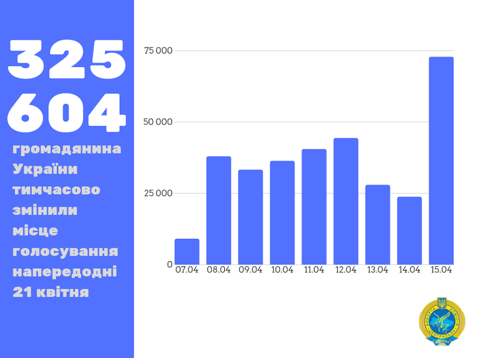 "Відділи ведення Державного реєстру виборців почали прийом одразу після оголошення ЦВК результатів голосування 31 березня. Фактично, з 7 по 15 квітня, своїм правом тимчасово змінити місце голосування скористалися 325 604 українця", - повідомилаСліпачук.