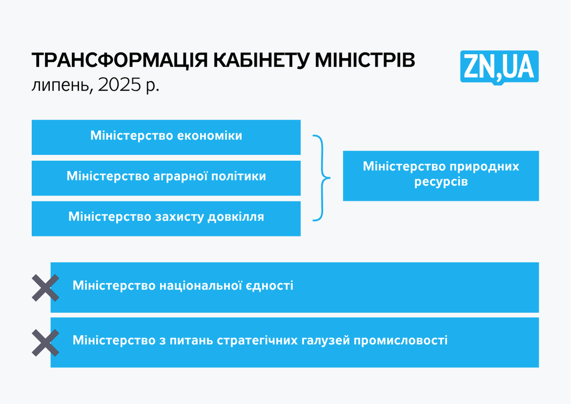 міністр економіки – Юлія Свириденко – тепер Олексій Соболев, в оновлене міністерство економіки, довкілля та сільського господарства увійшли Міністерство аграрної політики та продовольства та Міністерство захисту довкілля та природних ресурсів, які більше не є самостійними відомствами;