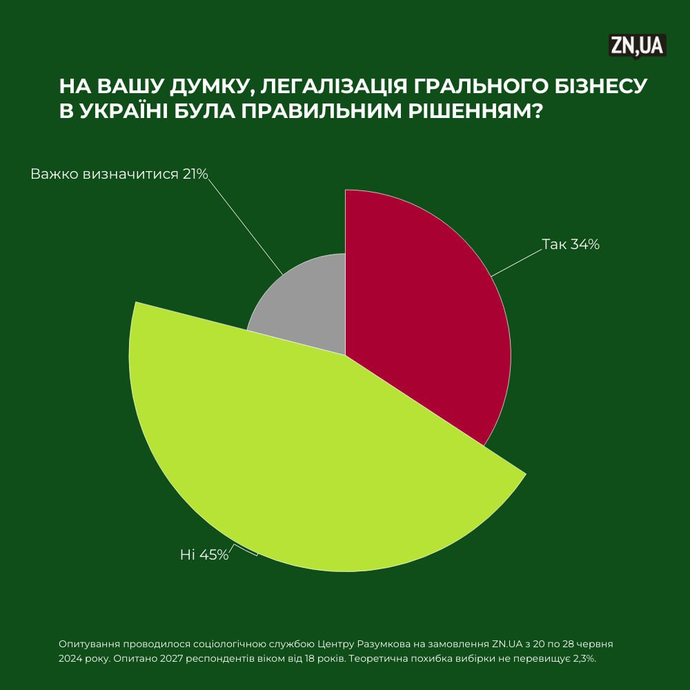 Таку позицію підтримують і українці. Так, під час соціологічного опитування, яке на замовлення ZN.UA провів Центр Разумкова в червні 2024 року, респондентів запитали: «На вашу думку, легалізація грального бізнесу в Україні була правильним рішенням?».