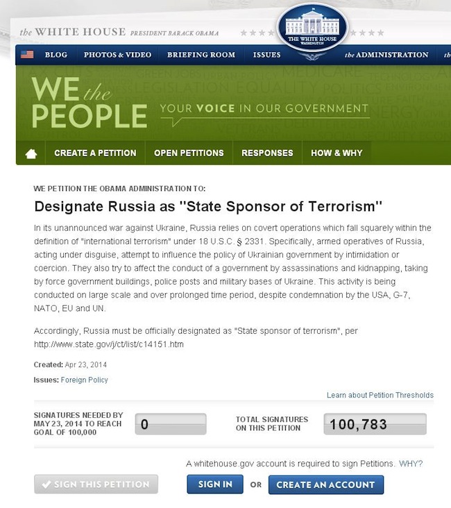 Петицію, в якій міститься прохання до адміністрації президента США визнати Росію спонсором тероризму, підписало вже понад 100 тисяч осіб. Про це повідомляється на сайті Білого дому.