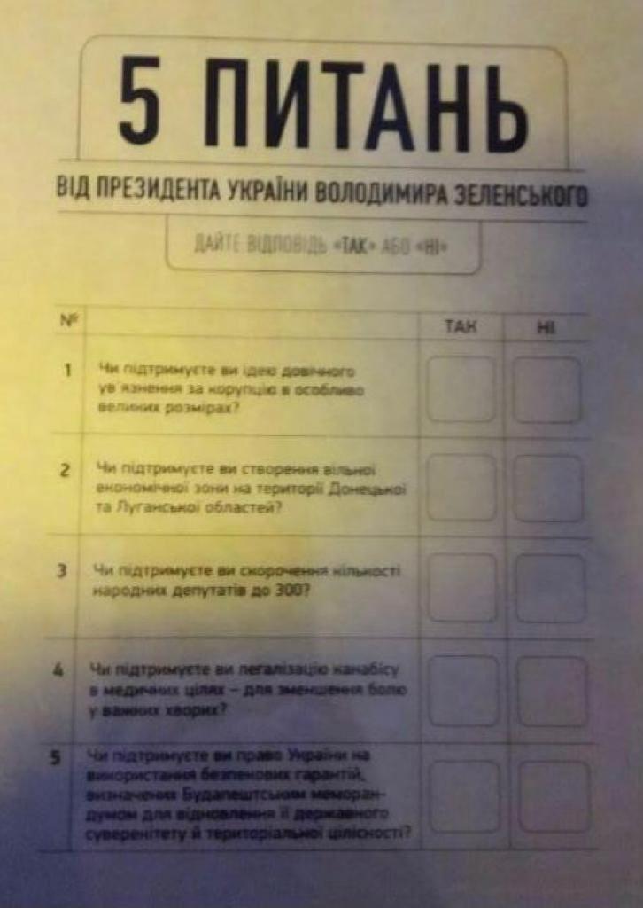Джерела ZN.UA на Банковій розповіли, що для проведення опитування планується надрукувати п'ять мільйонів бюлетенів. Питання щодо статусу Криму та Донбасу, імовірно, не ставитимуться, а теми будуть орієнтовані на молодь як на електоральне ядро «Слуги народу». А перший заступник голови ВР Руслан Стефанчук припустив, що деякі з них згодом можуть стати питаннями всеукраїнського референдуму.