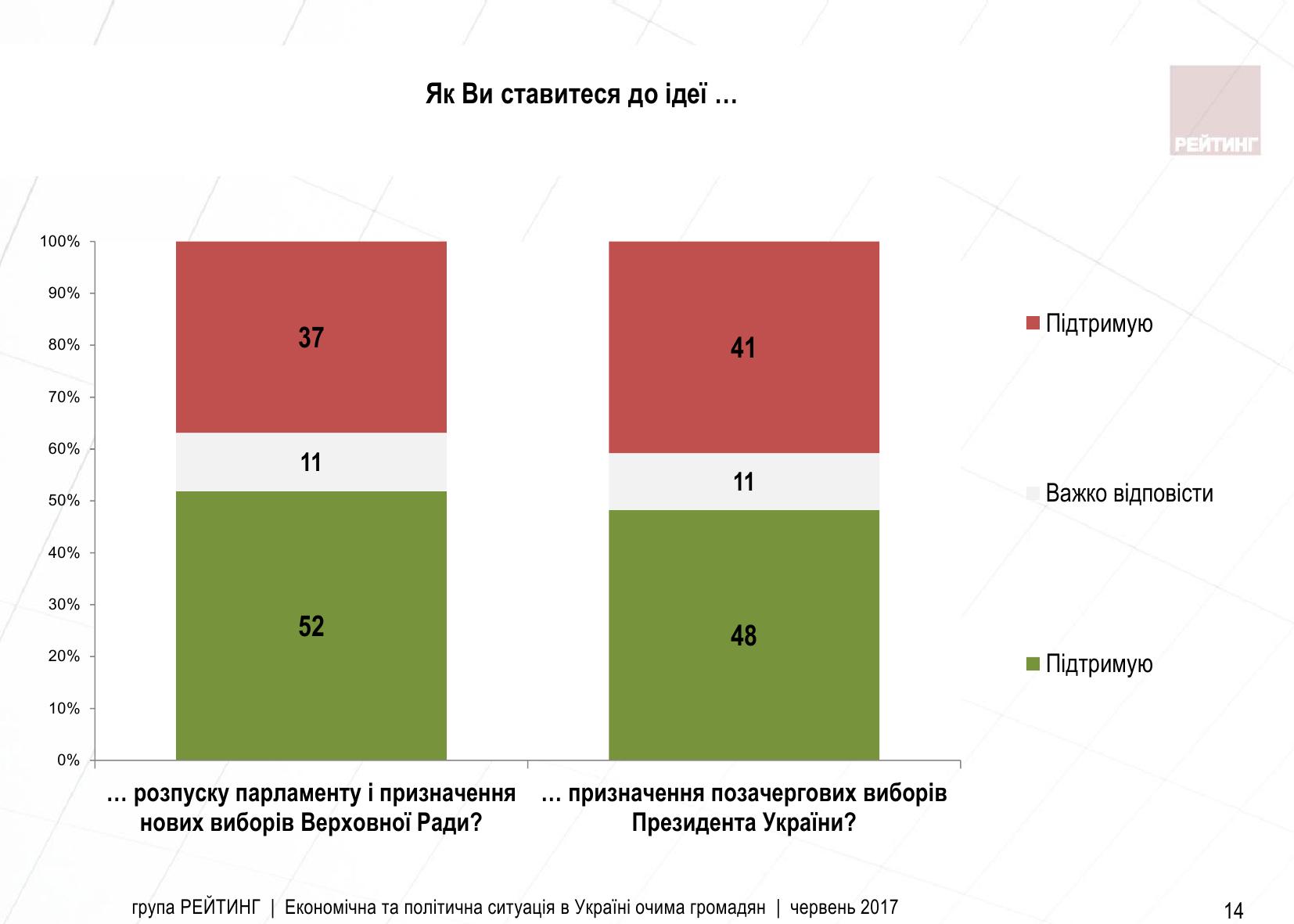 Наприкінці травня 2017 року половина українців (52%) підтримували ідею розпуску парламенту і призначення нових виборів Верховної Ради, 37% не підтримували цю ідею, 11% не визначилися з відповіддю, свідчать дані опитування Соціологічної групою "Рейтинг".