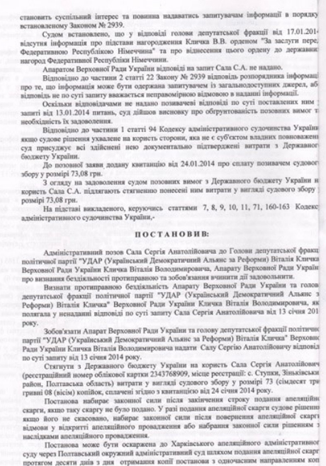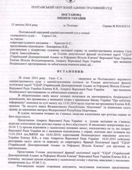 Полтавський окружний адміністративний суд зобов'язав лідера "УДАРу" Віталія Кличка пояснити, на яких підставах йому дали орден "За заслуги перед Федеративною Республікою Німеччина". Відповідну постанову суд виніс 13 лютого.