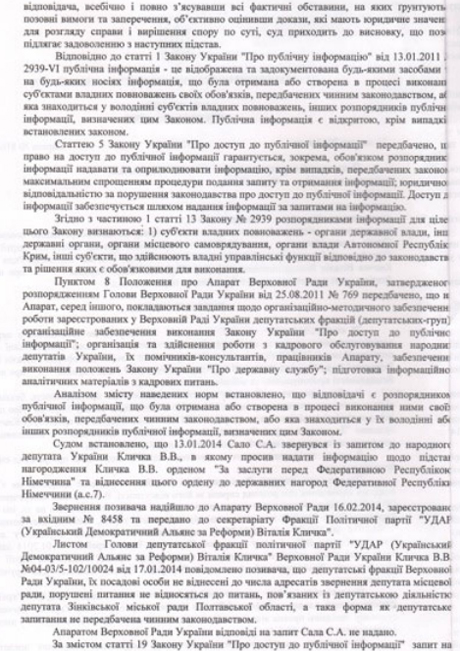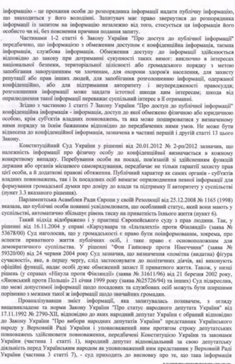 "Проаналізувавши зміст інформації, яка запитувалася позивачем, положення чинного законодавства, правову позицію Конституційного суду, викладену у рішенні від 20 січня 2012 року, а також прийнявши до уваги резолюцію ПАРЄ від 25 грудня 2008 року Полтавський окружний адмінсуд прийшов до висновку, що така інформація становить суспільний інтерес і повинна надаватися запитувачем інформації у порядку, встановленому законом", - йдеться в повідомленні.