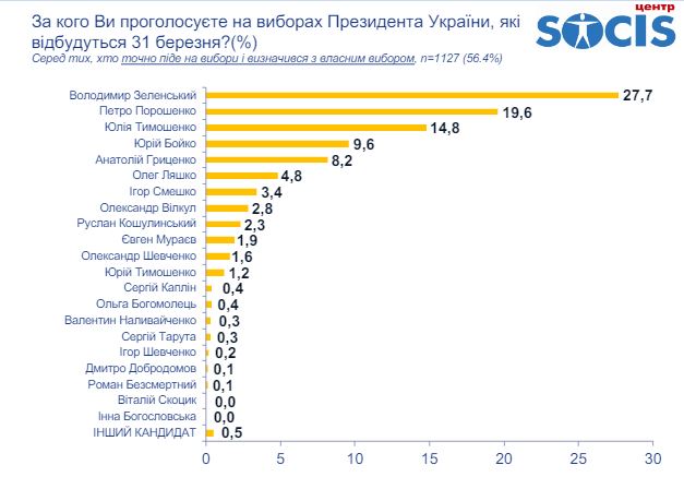Зокрема на вибори 31 березня підуть 73% українців, серед яких 18,5% ще не визначилися із своїм вибором (загалом в країні 23,9% громадян досі не визначилися, кого підтримати). Серед тих, хто піде на вибори найбільша частина висловлює підтримку Володимиру Зеленськом – 20,7%, на другому місці попри корупційні скандали в оборонному секторі чинний президент Петро Порошенко з 13,2% голосів, на третьому лідер "Батьківщини" Юлія Тимошенко з 11%. За кандидата від "Опозиційної платформи - За життя" Юрія Бойка готові проголосувати 6,5% опитаних, за лідера "Громадянської позиції" Анатолія Гриценка – 5,8%, лідера "Радикальної партії" Олега Ляшка – 3,5%.